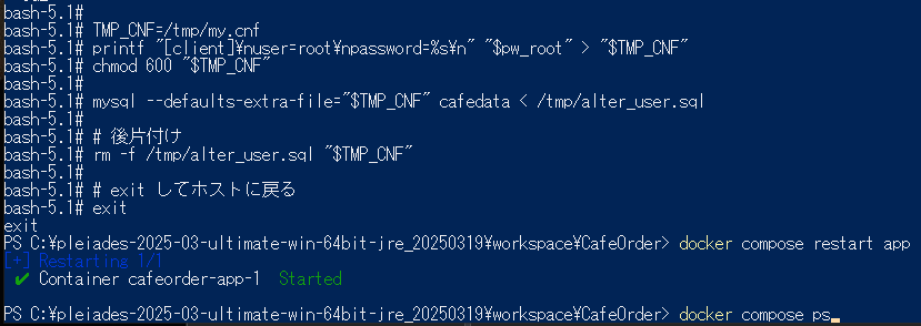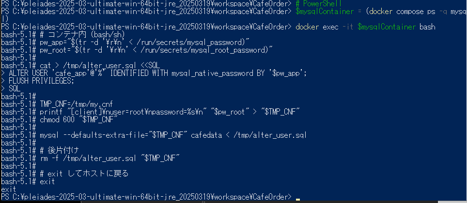 mysql --defaults-extra-file="$TMP_CNF" cafedata < /tmp/alter_user.sql