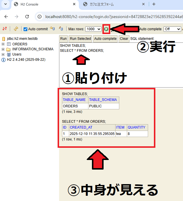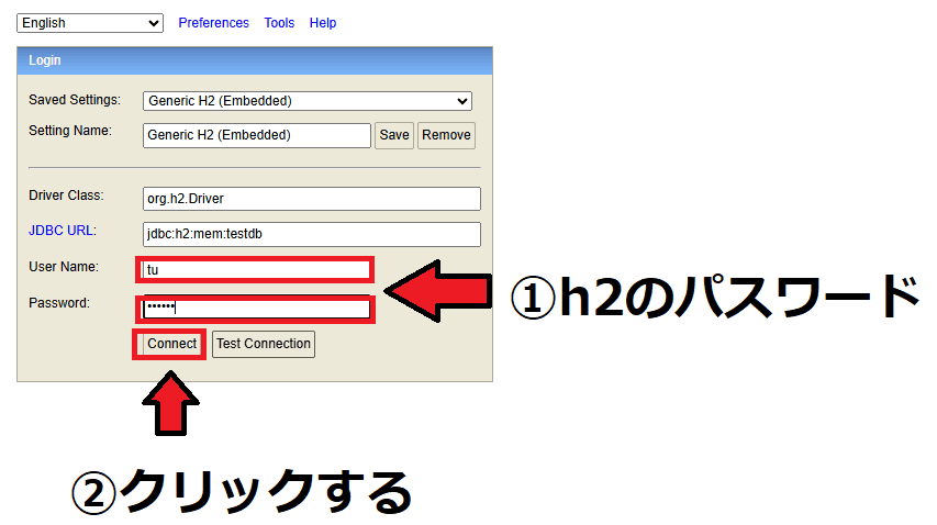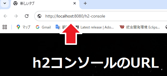 「http://localhost:8080/h2-console」と入力してください。「/h2-console」の部分は、データベースを管理するシステムの場所を示します。