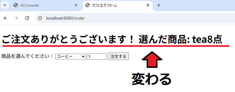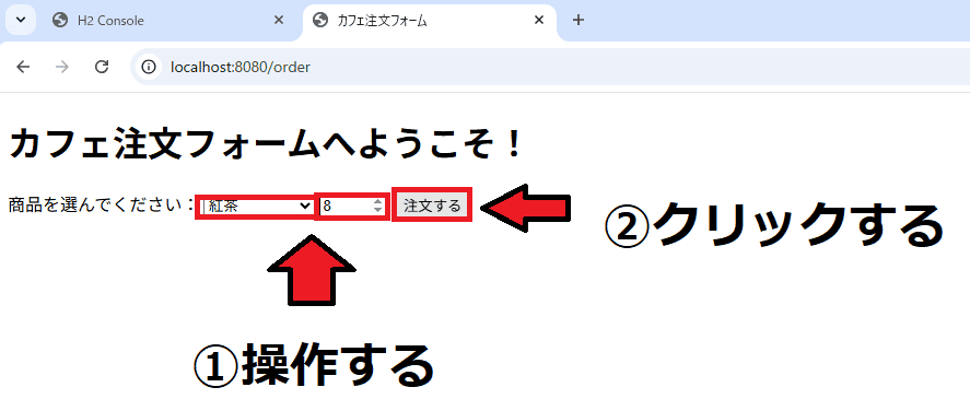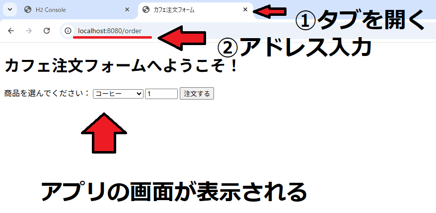 制作したアプリのホーム画面を表示します。水がめの場合は「http://localhost:8080/order」です。