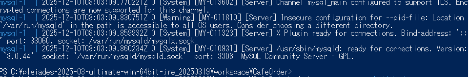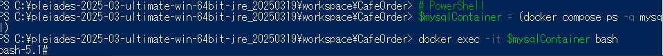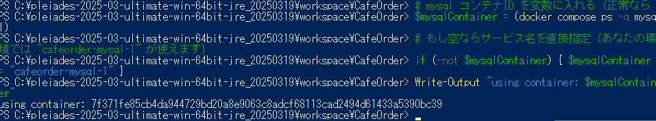 # もし空ならサービス名を直接指定(みずがめの場合 "cafeorder-mysql-1" が使えます)