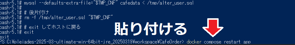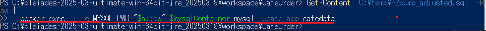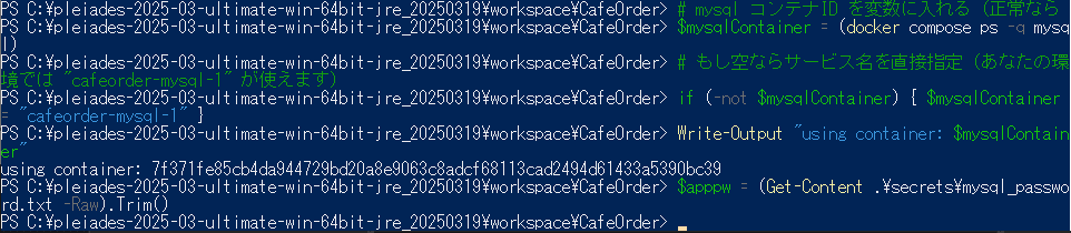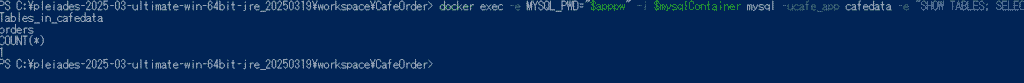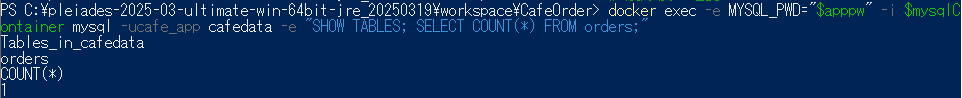 docker exec -i -e MYSQL_PWD="$apppw" $mysqlContainer mysql -ucafe_app cafedata