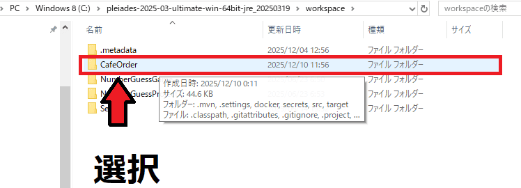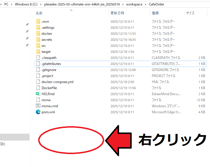 CafeOrderフォルダに入った状態で、上画像の位置に「PowerShell」と入力し「Enterキー」を押します。