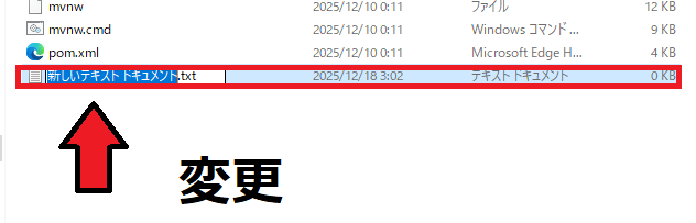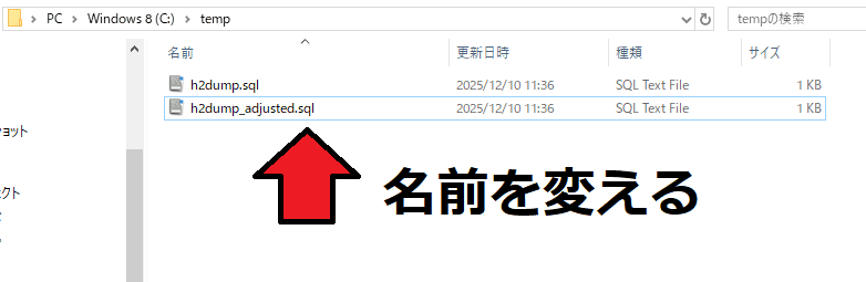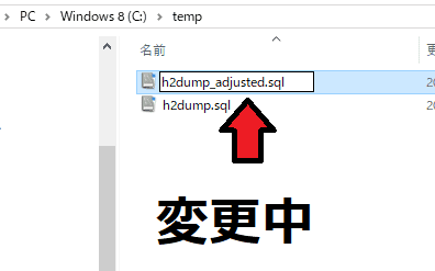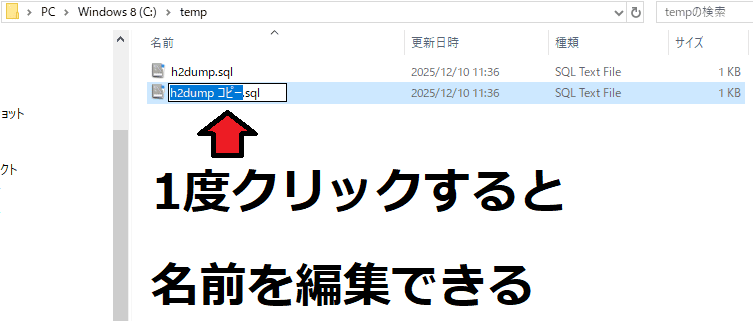 「h2dump – コピー.sql」の上でクリック(ダブルクリックするとファイルが開くため、1秒ほど間を開けてクリックするといい)すると、名前部分を選択している状態になります。