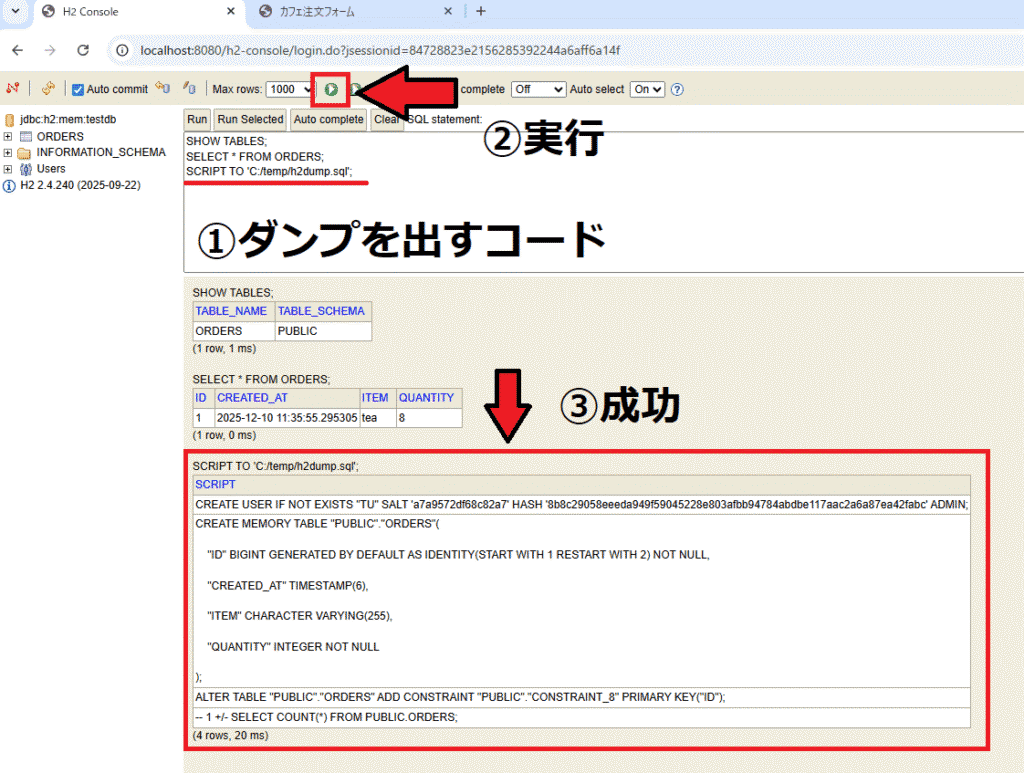 上記のコードは、Cドライブ直下にある「temp」の中に「h2dump.sql」という名前のダンプファイルを作成する命令です。