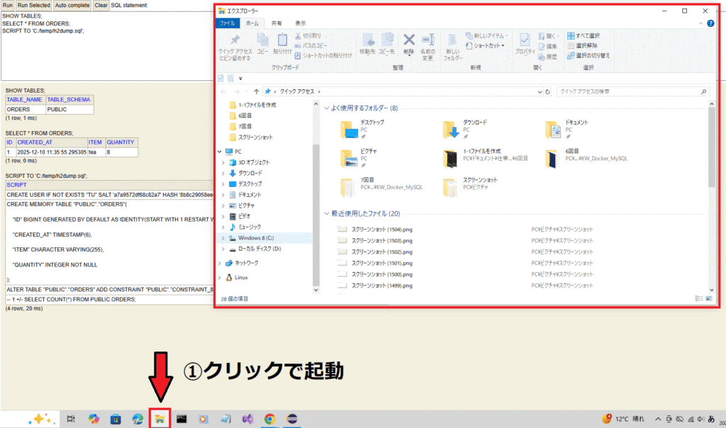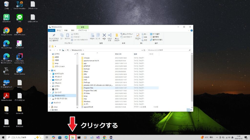 画像のように、Windowsのタスクバーにあるエクスプローラーを起動します。すると、メニュー画面が表示されます。