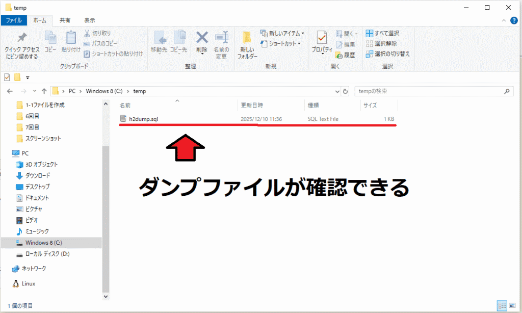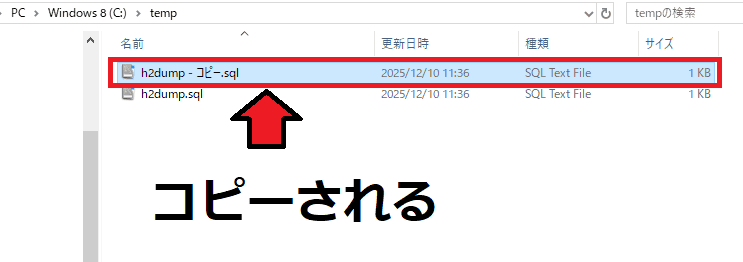 「h2dump – コピー」が作成されました。2つのダンプファイルのうち、1つは保存用として残してください。今回は「h2dump.sql」を保存用にします。