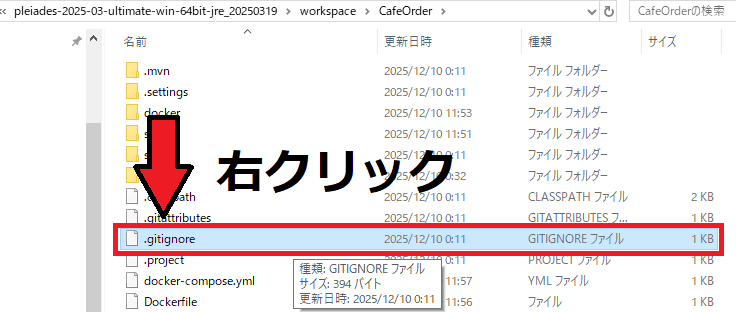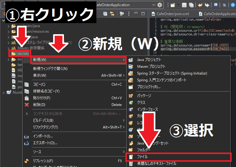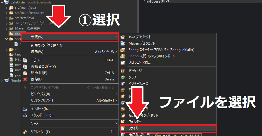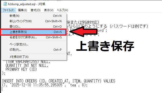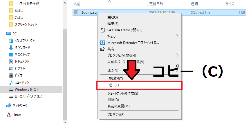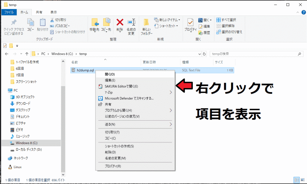 「h2dump.sql」の上にマウスカーソルを合わせて、右クリックして項目を表示させます。