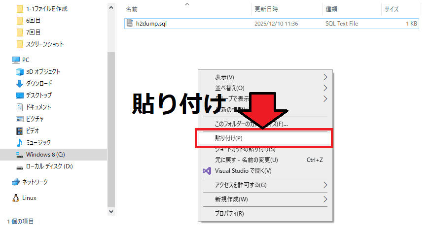 「h2dump.sql」の下にある空白エリアでマウスを右クリックし「貼り付け(P)」を選択します。「temp」ファイル内にダンプファイルのコピーを追加します。