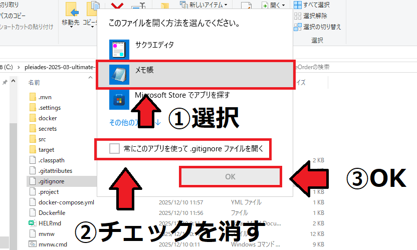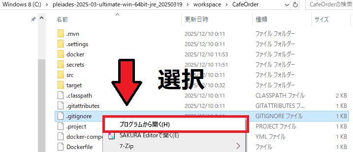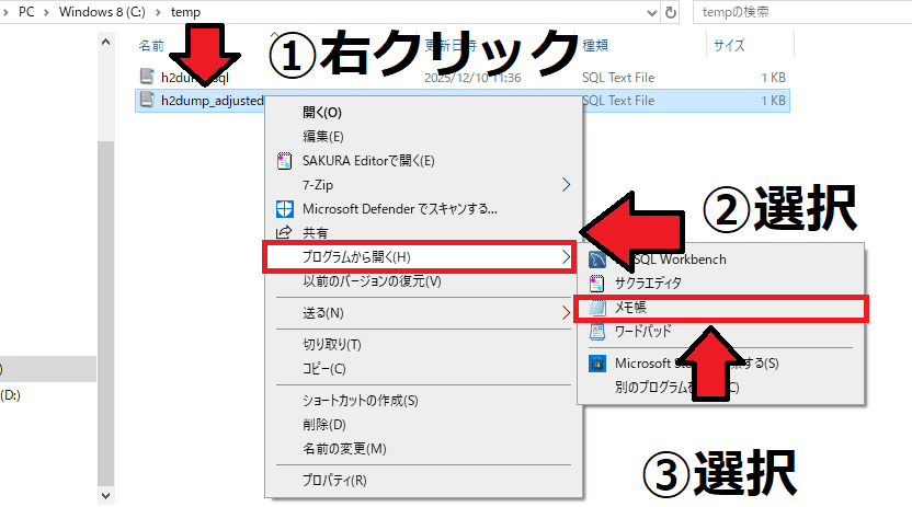 「h2dump_adjusted.sql」の上で右クリックするとメニュー画面が開きます。「プログラムから開く(H)」を選択するとさらに右側に選択画面が拡張されます。