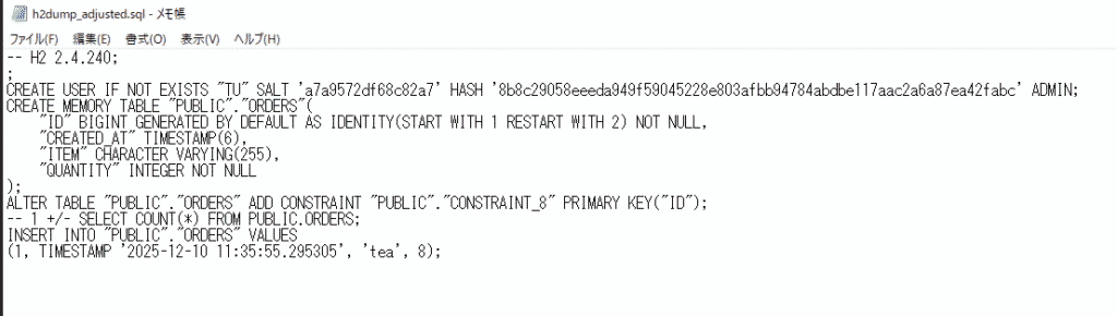 「h2dump_adjusted.sql」の中身が確認できます。このままMySQLに入れてしまうと、命令文の違いにより正しく読み込まれないため、修正していきます。