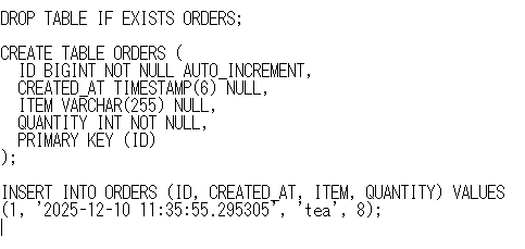INSERT INTO ORDERS (ID, CREATED_AT, ITEM, QUANTITY) VALUES