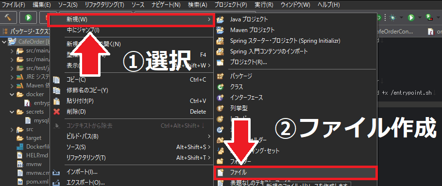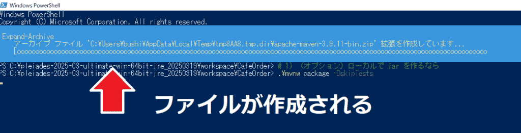 Dockerでコンテナをビルド(必要なファイル一式を作成)します。Dockerのイメージにアプリの情報を組み込むため、JARファイルを作成するコマンドを入力してください。