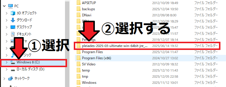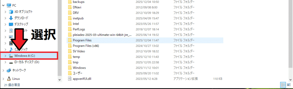 「PC」の中にある、Cドライブを意味する「Windows」をクリックします。この部分はパソコンによって異なり「Windows-SSD」と書かれてる場合もあります。