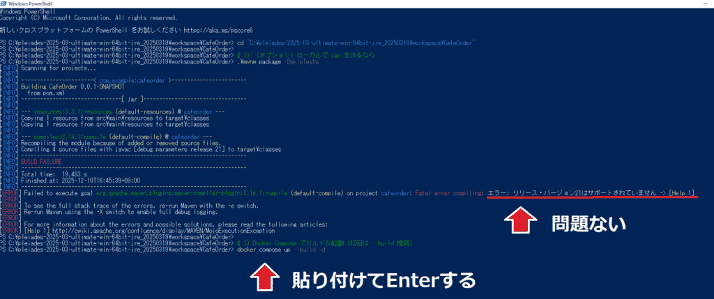 10秒ほど待つと、実行結果が表示されます。上画像の「リリース・バージョン21はサポートされていません」とは、パソコンにあるJDKがJava21をサポートしていないという警告です。