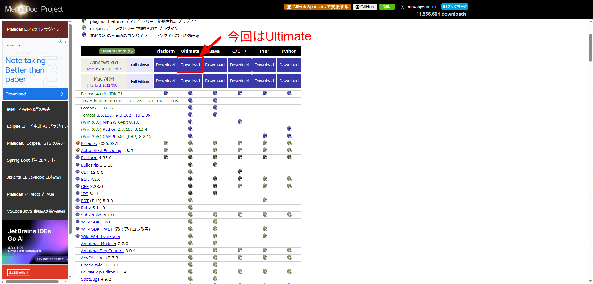 上の画像は、「Pleiades All in One」の公式サイトで、内蔵するEclipseの仕様がバージョンごとに解説されています。今回は最新の「Eclipse 2025」をクリックします。