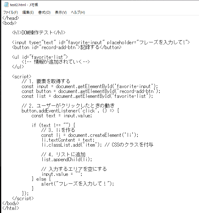 Windowsに備わっているメモ帳をベースにDOM操作コードを解説します。低スペックのノートパソコンでも開発可能なため、チャレンジしてみてください。