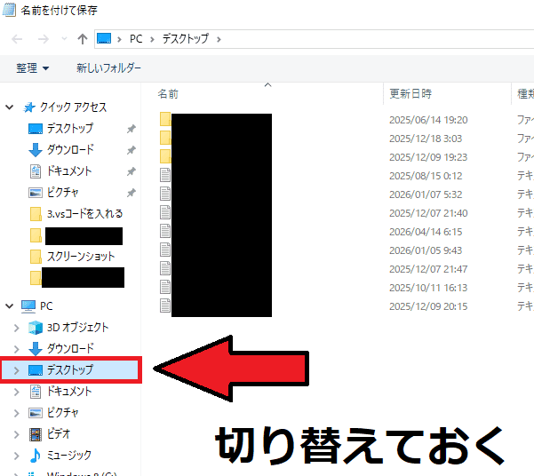 エクスプローラー(パソコン内のファイルやフォルダをまとめて表示するアプリ)が立ち上がります。「デスクトップ」に切り替えておきましょう。