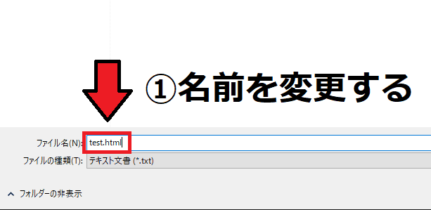 ウィンドウの左下にある「ファイル名(N):」を「test.html」に変更しておきます。