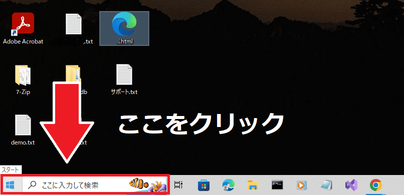 パソコンを起動して、画面左下にある「ここに入力して検索」にマウスを合わせて一度クリックしてください。