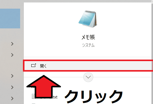 下の画像のように「開く」をクリックすると、メモ帳が起動します。