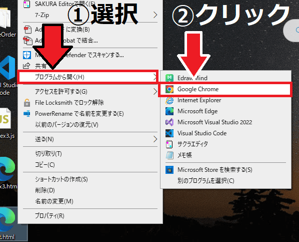「プログラムから開く(H)」を選択して「Google Chrome」をクリックします。