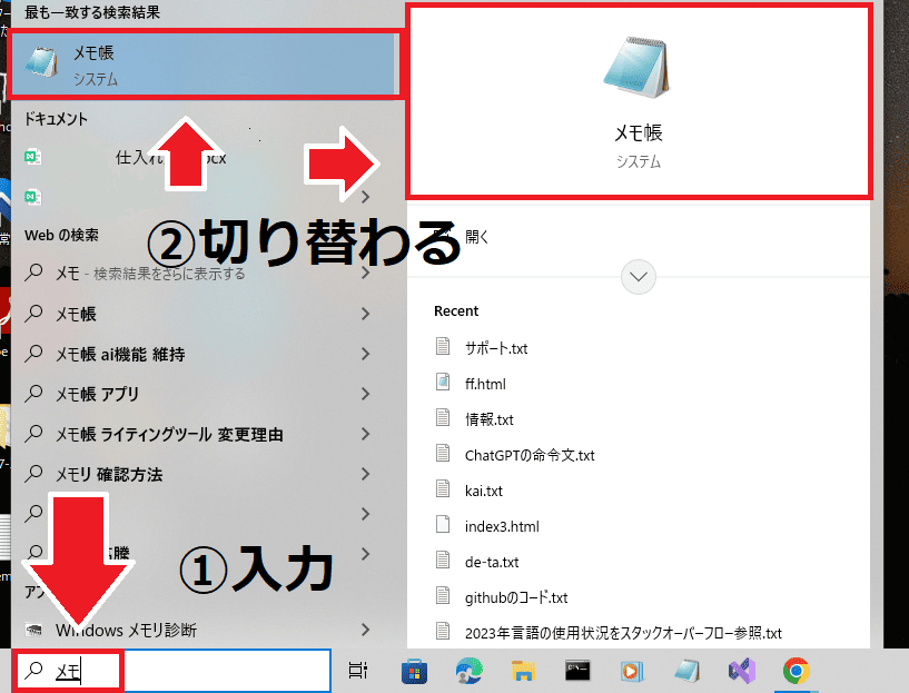 検索窓に「メモ」と入力します。検索候補に「メモ帳」が表示されます。